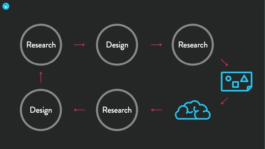 Design Research beginnt den Kreislauf mit Forschung, die vorhandene Möglichkeiten evaluiert. Danach folgt eine Phase, in der designt wird, wie die Forschung aufgebaut werden soll. Daraus entsteht in der Forschung ein Prototyp, der mit dem Nutzer abgetestet wird. Daraus wird neues Wissen generiert, welches wieder erforscht wird. Das ist ein Kreislauf der wiederholt werden kann, bis das erwünschte Ergebnis erreicht ist.