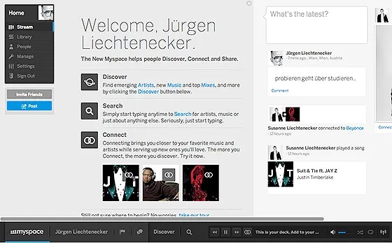 Einen Neuversuch gab es bereits 2010, die Plattform versuchte nicht mehr, sich an Facebook anzunähern, sondern konzentrierte sich wie der Schuster auf seine Leisten: Musik. Darüber haben wir damals berichtet. Eingefahren ist es damals nicht, Facebook und Twitter waren einfach zu präsent. Im Sommer 2012 hab ich über das neue Myspace gelesen und mein Interesse wurde geweckt, da ich die neuen Streamingdienste wie zum Bespiel Spotify nicht nutze, sondern eher auf der Suche nach einer echten Musikplattform für den Austausch bin. Nun, gestern war es soweit und ich habe die ersten Klicks hinter mir.