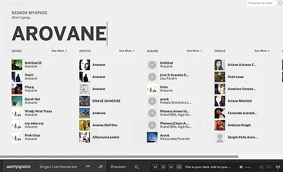 Warum ich gleich so begeistert war, liegt am frischen und modernen Interface. Facebook hat es bis heute nicht geschafft ansprechend auszusehen, das Interface ist trotz ständiger Neuerungen in die Jahre gekommen. Genau deswegen hat es Myspace besonders leicht. Müde von Facebook glänzt das neue Design. Schöne Typografie, Motion Experience und klare Übersichtlichkeit kommen einem entgegen. Der größte WOW Effekt war für mich die innovative Suchfunktion, so etwas habe ich noch nie gesehen. Kein klassisches Suchfeld, sondern supergroße Buchstaben bringen gut sortierte Echtzeitergebnisse. Bravo erstmal!