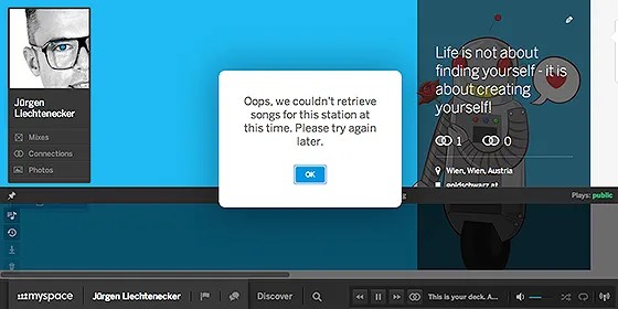 Der ganze Player-Bereich befindet sich unten und ist schnell „erlernbar“. Hier kann man zwischen Radio und normalen Streaming switchen. Ebenso sind die wichtigsten Features wie Nachrichten. in einer transparenten Timeline angeordnet. Ein großes Plus für das Interface, jedoch setzt das Design auf horizontales Scrollen. Das musste erstmal entdeckt werden. Das Hauptmenü ist wie gewohnt oben links plaziert. Sauber ist alles mit HTML5 gemacht und ich konnte bisher keine Browserindifferenzen festellen. Es läuft schnell und flüssig. Ganz responsive ist es nicht, nur irgendwie die Hälfte, da hätte ich mir mehr erwartet. Mobil gibt es derzeit keinen Zugriff, bald wird die Myspace APP auftauchen. Warum sie das nicht gleich mitgemacht haben verstehe ich nicht. In der unteren Timeline, kann man auch perfekt mit Drag & Drop arbeiten. Das ganze Netzwerk funktioniert von links nach rechts anstatt von oben nach unten. Gewöhnungssache, aber ganz frisch gelöst.