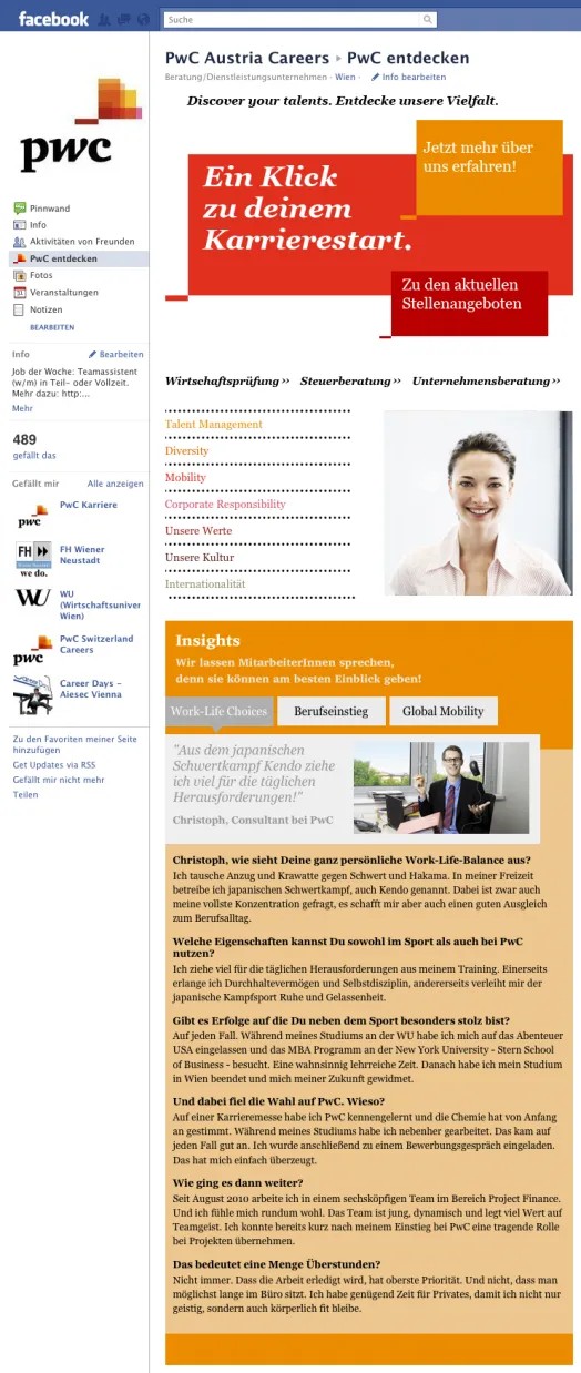 Für PwC Österreich sind junge Talente eine wichtige Zielgruppe. Mit diesen High Potentials soll der Dialog auch auf Facebook gesucht werden, um PwC als attraktiven Arbeitgeber zu zeigen.