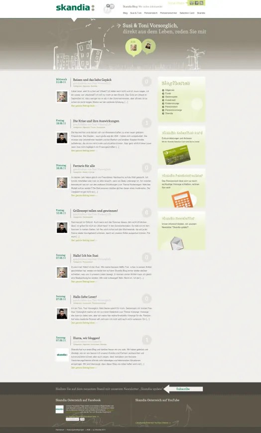 Auf Basis dessen entstanden unsere beiden Charaktere Susi und Toni Vorsorglich. Ein Ehepaar, welches sich auf emotionale und humorvolle Art und Weise mit den Themen Pension, Vorsorge und Investment beschäftigt aus User- bzw. Kundensicht. Skandia zeigt mit dem Blog: Jeder hat zu ihren Themen etwas beizutragen und soll das auch tun können. Sie geben hier nicht den Ton an.