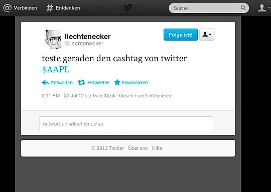 Nun gibt es eine neue Idee der automatischen Verlinkung: Der „Cashtag“. Jeweils das Börsenkürzel der Unternehmen mit einem „$“ Zeichen vorangesetzt, verlinkt dies Twitter automatisch und zeigt dementsprechende Börseninformationen.