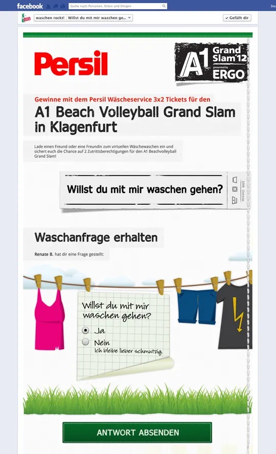 Wir wurden von Henkel gebeten in kürzester Zeit ein Gewinnspiel für Tickets für die nächsten Events auf denen Persil mit dem Wäscheservice vertreten ist für die Facebook Fanpage „waschen rockt“ zu realisieren. Dabei sollte die Sauberkeit im Zentrum stehen und die Logik zwar unterhaltsam aber möglichst einfach sowie mehrfach anwendbar sein.