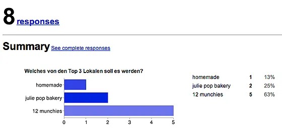 Wie unten beschrieben ist das Voting abgeschlossen und es ist entschieden. Die glücklichen Gewinner sind die 12munchies. Dort gibt es britisch amerikanische Bäckereien, in einem sehr coolen Ambiente. Eine Webseite haben die Jungs verdient, wir freuen und schon auf die Umsetzung.