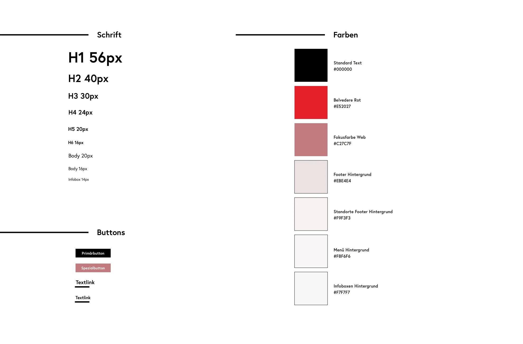 Die Farbwelt des Belvedere mit Weiß, Rot und Schwarz lebt auf der Website mit einigen zusätzlichen Creme-Pink-Tönen weiter. Die neuen pastellen Farben waren für ein userfreundliches Interface notwendig um eine Hierarchie der Inhalte zu ermöglichen. Vor allem das Belvedere-Rot konnte nur spärlich eingesetzt werden, da gerade im Web Rot häufig für Fehlermeldungen verwendet wird und wir die Seitenbesucher:innen in diesem gewohnten Muster nicht überfordern wollten.