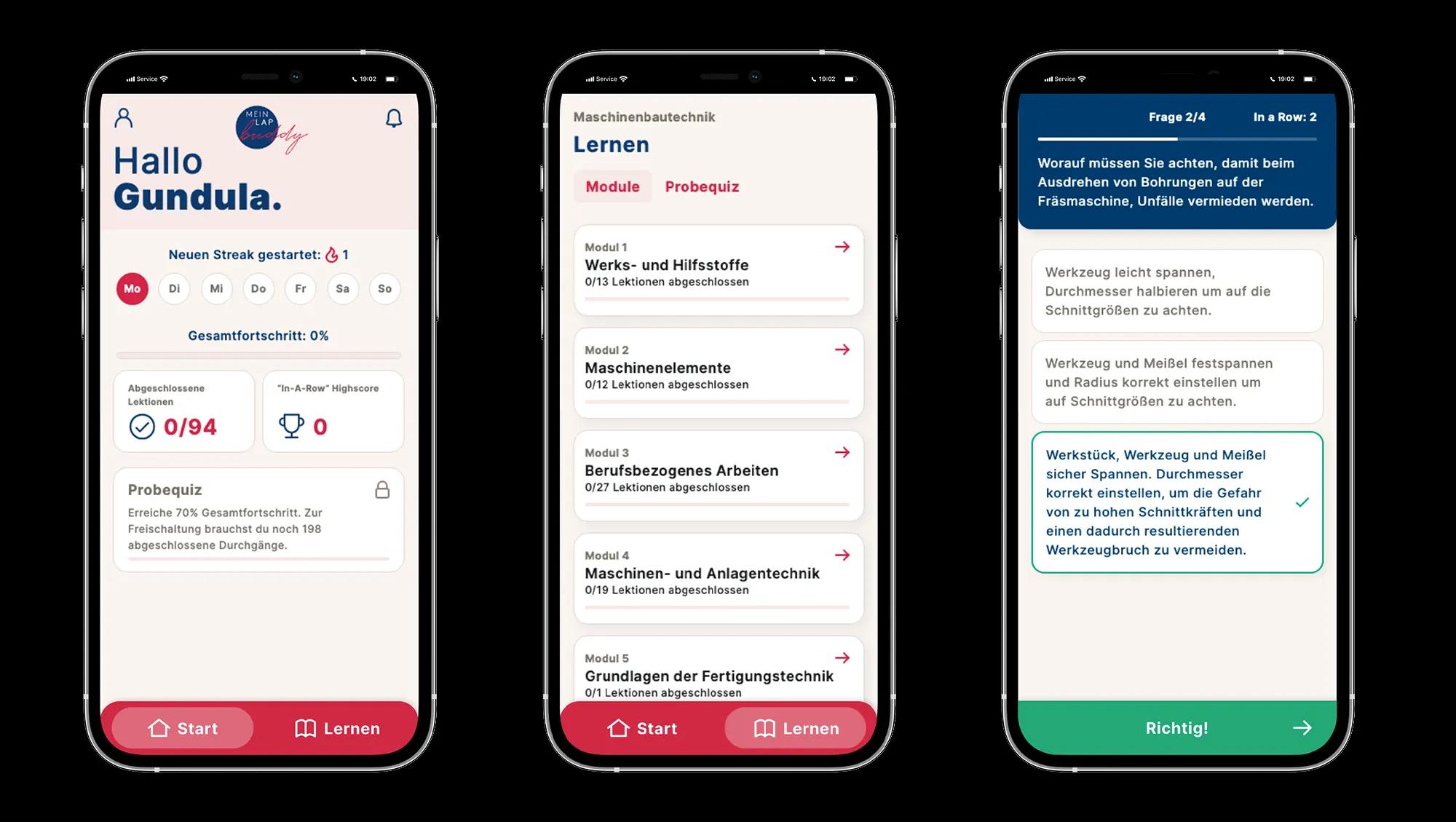 Durch die Nutzung der neuesten zur Verfügung stehenden technischen Möglichkeiten erfolgt das Lernen der Prüfungsfragen, aufgeteilt in Module und Lektionen, zeitlich wie örtlich ungebunden auf allen gängigen digitalen Endgeräten. Die integrierten Gaming-Effekte machen die Vorbereitung auf den Abschluss des Lehrberufs zusätzlich attraktiv, denn das Absolvieren des theoretischen Teils der Lehrabschlussprüfung bekommt damit spielerische Elemente.